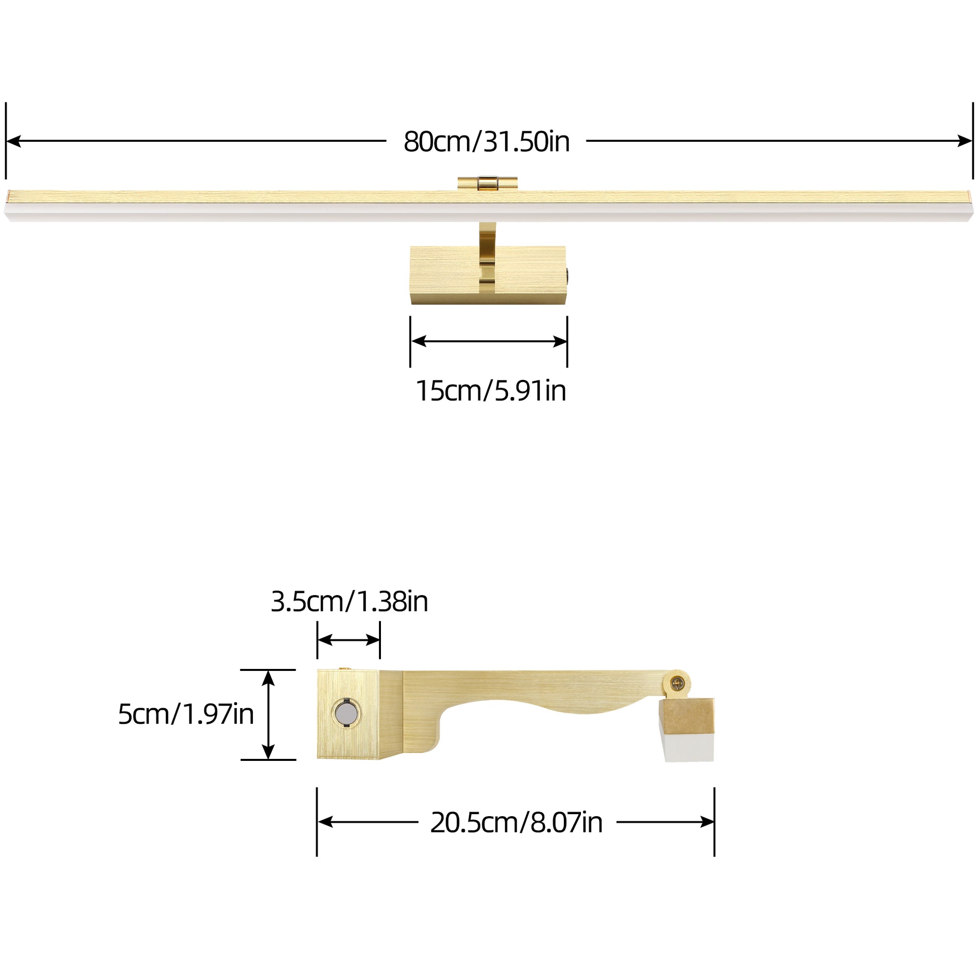 【Detailed Parameters】Aluminium material and Acrylic lampshade,400mm*210mm*50mm / 600mm*210mm*50mm / 800mm*210mm*50mm ,Matte gold finish. Built-in 45pc 2835 SMDs of 8W/12/16W and CE certified drive. 920/1320/1820lm, CRI 90 makes the light more gentle and perfectly illuminating your painting. 24 month warranty, 60 days Refund Guarantee and 24hrs response.